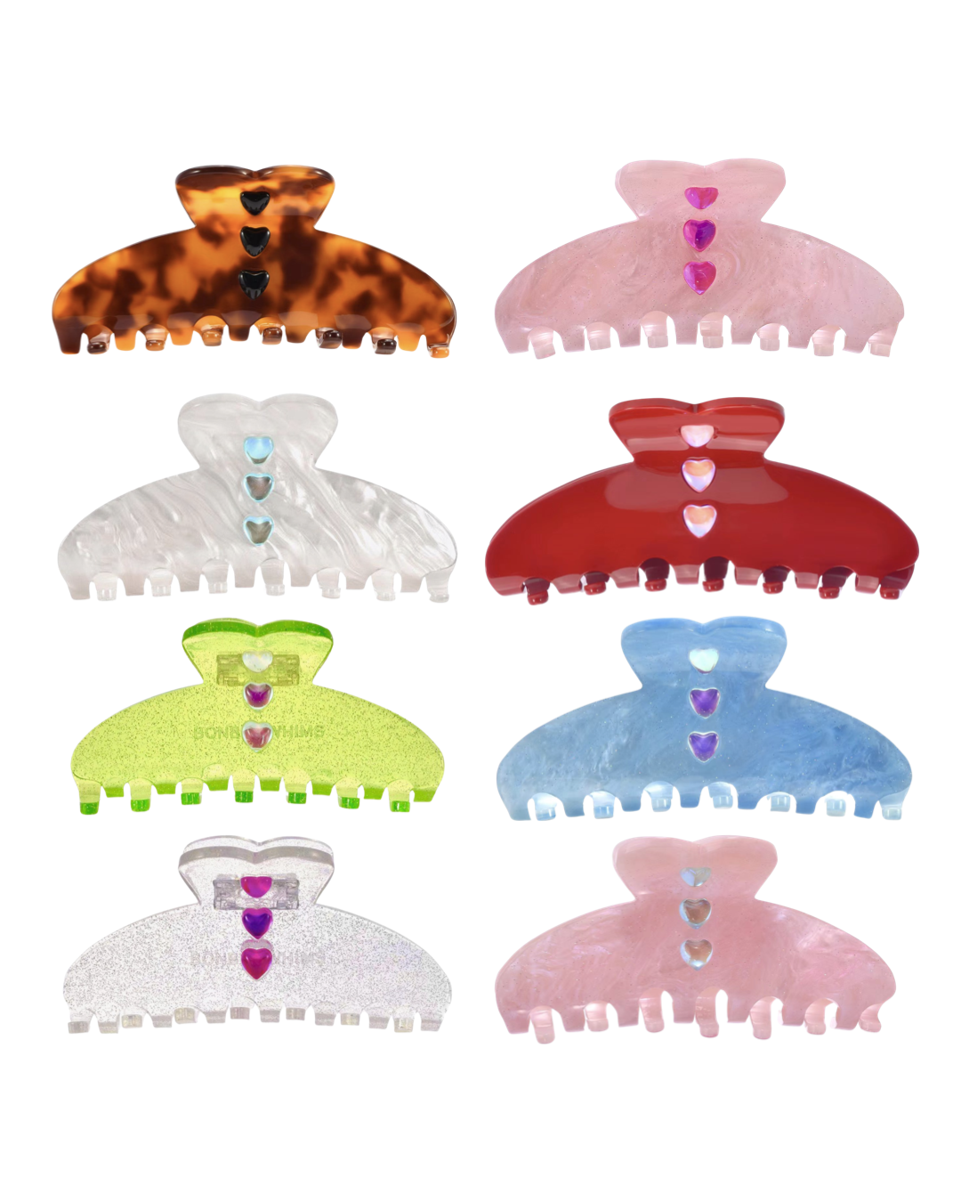 As seen on ALLURE as Best Claw Clip! Our whimsical Claw Clip oozes quintessential BONBONWHIMS aesthetics -- from our proprietarily designed heart-shaped outline that's unique to us, to the glossy finishes of pink, sparkles and iridescence! Made with premium recyclable acetate and hand-set with opalescent heart gems, our claw clips are biodegradable. Stamped with BONBONWHIMS logo inside, and packaged in our ready-to-gift baby pink velvet pouch!