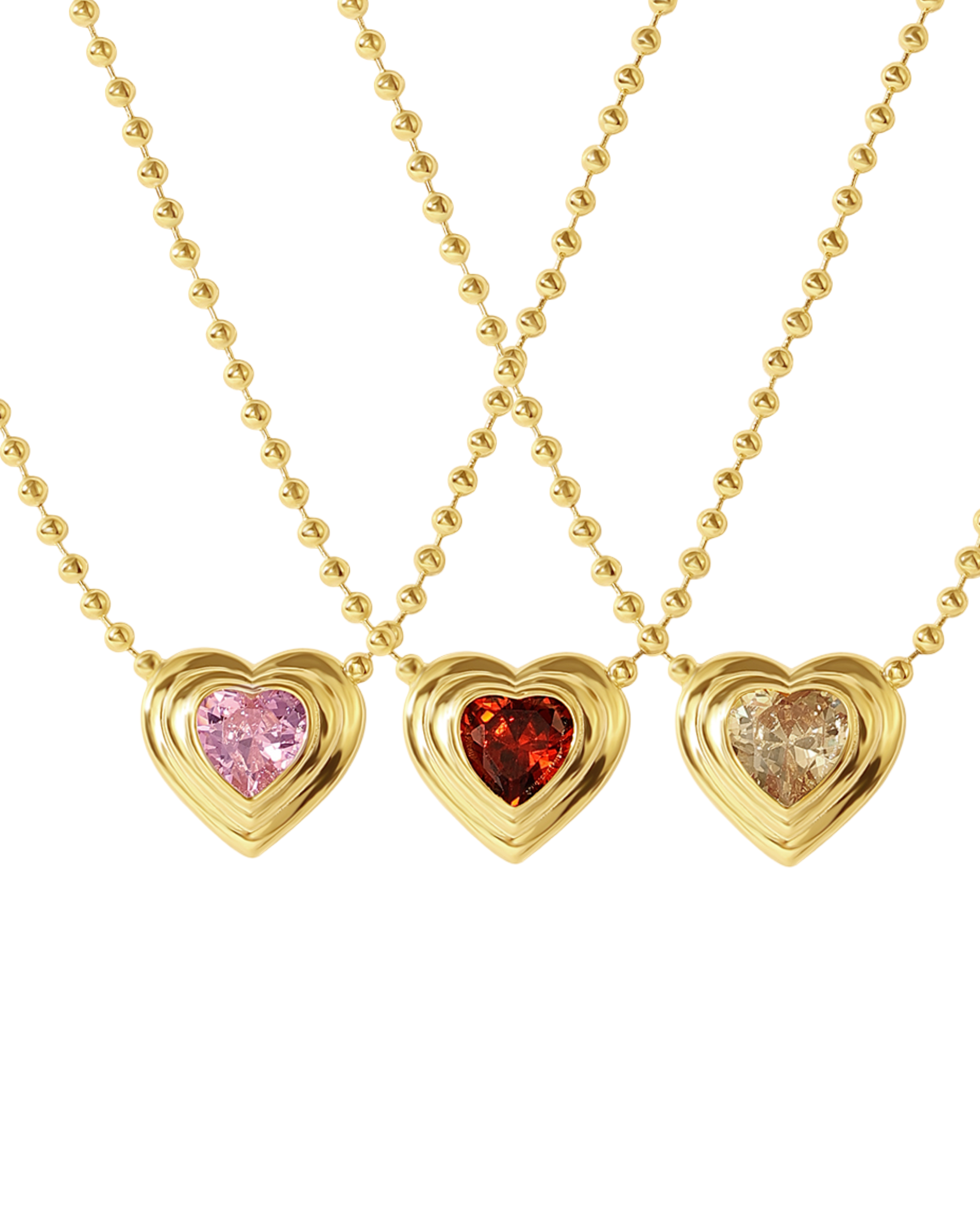 Made of buttery 14 gold-plated metal, this piece features a romantic setting of a premium crystal heart & ball chain necklace, adding a touch of elegance and playfulness. Available in blush pink, classic red and champagne yellow. Measures at 16" long with 2" extension.